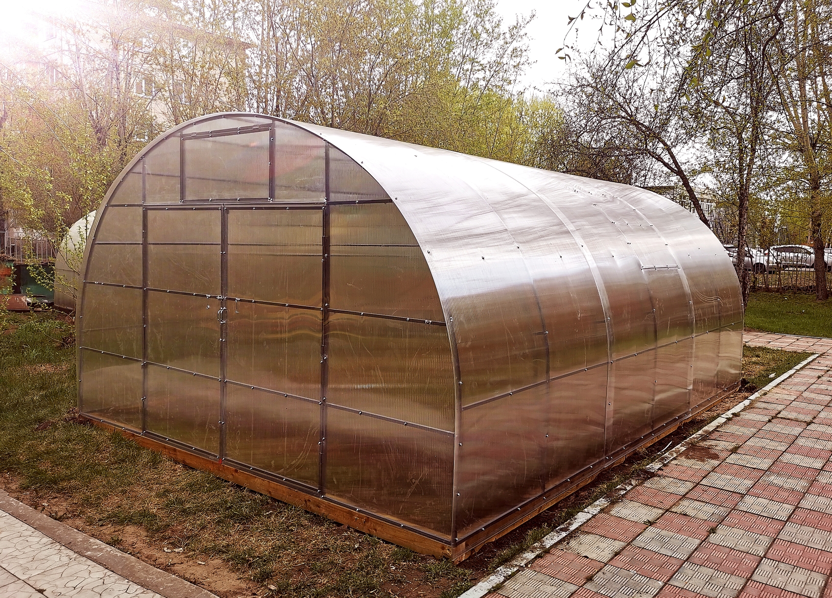В торце теплицы, предусмотрены, две широкие двери (ширина 1мtnh) и дополнительно большие форточки. Торец дополнительно усилен.